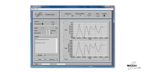 测试过程中,测量滑块以规定的起始速度(100mm/min)克服摩擦阻力,功率计记录所产生的摩擦力值。测量距离约为60mm。测试之前,可以通过软件设定起始速度范围5-300mm/min。该装置配有20N摩擦力值传感器,通过放大器和USB接入电脑。软件包括14bit分辨率的USB 测试模块。测量滑块下方可以加载一个加热板,测量温度可以升至80°C。