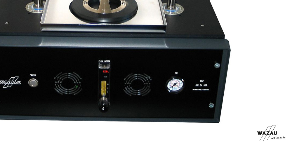 水平固定的样品放置于气体燃烧器火焰上方,以80 kW/m²热流密度进行冲击。用量热计测量通过样品的热量,并记录样品温度上升12°C和24°C的时间。传热指数为三个样品测试结果的平均值。该装置由燃烧器、盖板和带样品夹具的量热计组成。该仪器由气动传动装置控制,该装置由软件进行控制、计算和标准化评估,以及丙烷气开关控制。为了安全起见,燃烧器配备了电偶电子引火器。