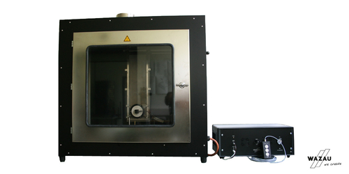 该仪器用于测试纤维织物和制品,评估垂直方向样品的燃烧和火焰蔓延性能。设备由燃烧箱、气动控制燃烧器(可垂直调节3种角度位置),燃烧器移动装置,热辐射器,量热计以及试样固定装置。软件可控制热辐射器温度、燃烧器移动、防护罩和数据采集。测试过程简要描述如下:具有给定热定值的热流被引导通过垂直样品背面下部的固定板。30秒后,小火焰被引导到在样品边缘固定的小块棉织上保持10秒。通过观察标记线断裂来测定火焰蔓延。